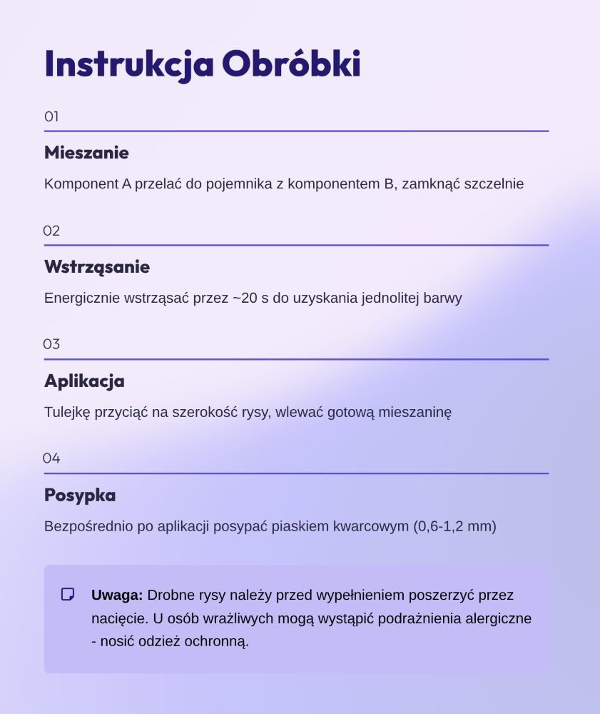 - Niska Lepkość: Dzięki swojej niskiej lepkości, żywica doskonale wpływa w najdrobniejsze rysy i spoiny, zapewniając głębokie wnikanie i skuteczne spajanie.